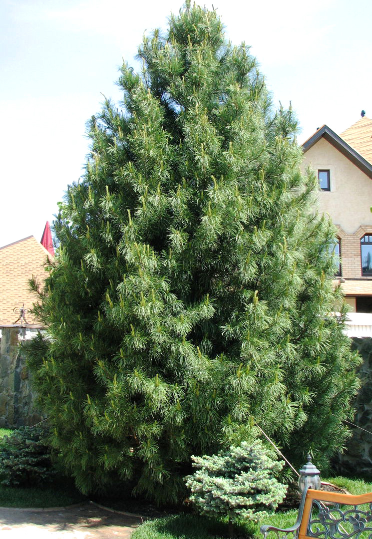 Саженец кедра корейского, высотой от 60 до 100 см, отличается пышной и мощной кроной. У молодых деревьев крона имеет форму округло-яйцевидную, тогда как у зрелых экземпляров она принимает цилиндрическую или коническую форму. С возрастом у кедра могут появляться несколько вершин, что связано с естественным стремлением дерева максимизировать поглощение питательных веществ и увеличить производство шишек. Иногда вершины деревьев ломаются под весом шишек, что приводит к росту новых вершин, а иногда их повреждают медведи, пытаясь добраться до шишек.